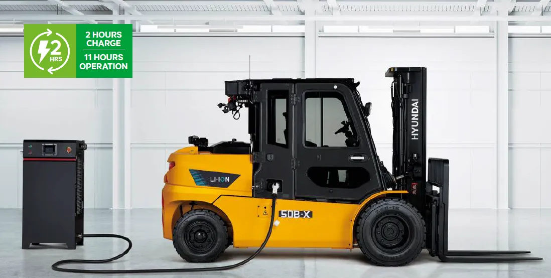 Trong thời kì mà việc bảo vệ môi trường được ưu tiên, sử dụng thiết bị giảm phát thải là bước đột phá để doanh nghiệp bắt kịp xu hướng xanh hóa trong nhà máy, do đó, ngày càng nhiều xe nâng điện mạnh mẽ thay thế xe nâng động cơ đốt trong. Dòng xe nâng điện Hyundai tải trọng từ 4 đến 5,5 tấn, thuộc series B-X mới nhất, với 4 model 40B-X/45B-X/50B-X/55B-X là lựa chọn tối ưu cho những doanh nghiệp cần thiết bị nâng hạ tải trọng nặng, hoạt động trong thời gian dài, hiệu suất tương đương xe nâng sử dụng động cơ đốt trong nhưng không phát thải và ít phải bảo trì.